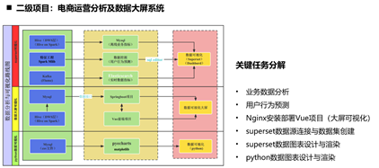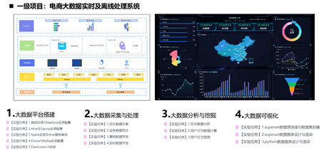 实训室配套二级项目基于高校大数据人才培养目标,对标目标岗位数据采集与处理工程师、大数据分析与可视化工程师、大数据实施与运维工程师的专业技术能力需求,旨在帮助学生夯实工程实践能力和提升岗位就业能力。