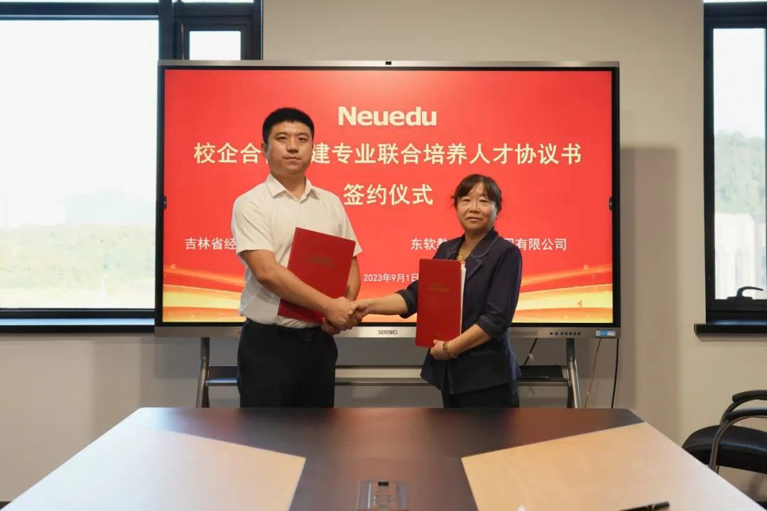 刘庆红院长与东北区负责人高殿杰代表双方签署校企合作共建专业联合培养人才协议书。