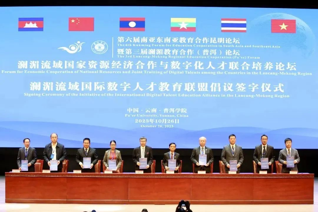 论坛中,举行“澜湄流域国际数字人才教育联盟”倡议签字仪式,美高梅美高教育科技集团、老挝苏发努冯大学、国立大学,缅甸仰光大学、仰光外国语大学,泰国清莱皇家大学、格乐大学,中央民族大学、昆明理工大学、普洱学院等二十余家院校单位共同签署“澜湄流域国际数字人才教育联盟”倡议。