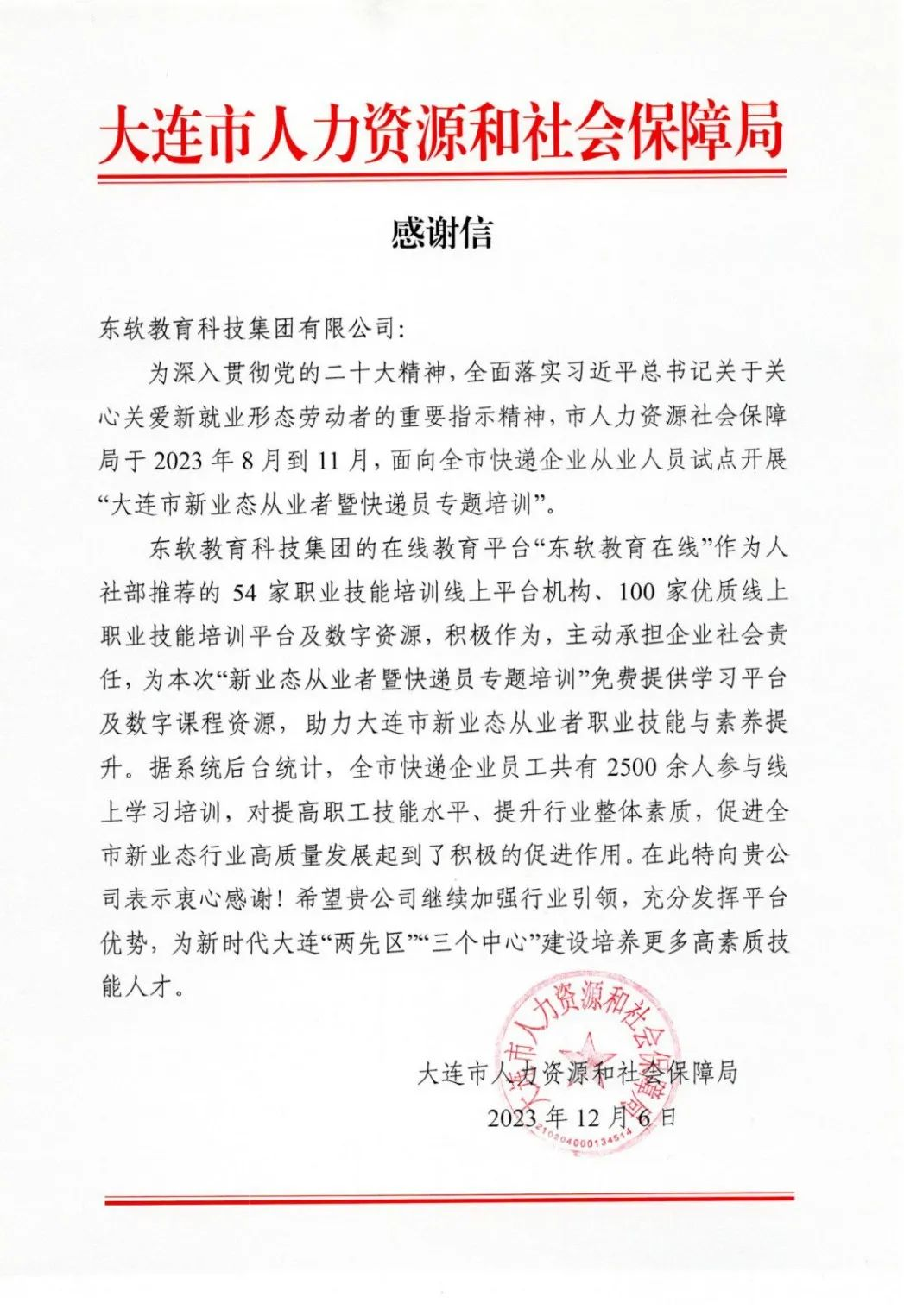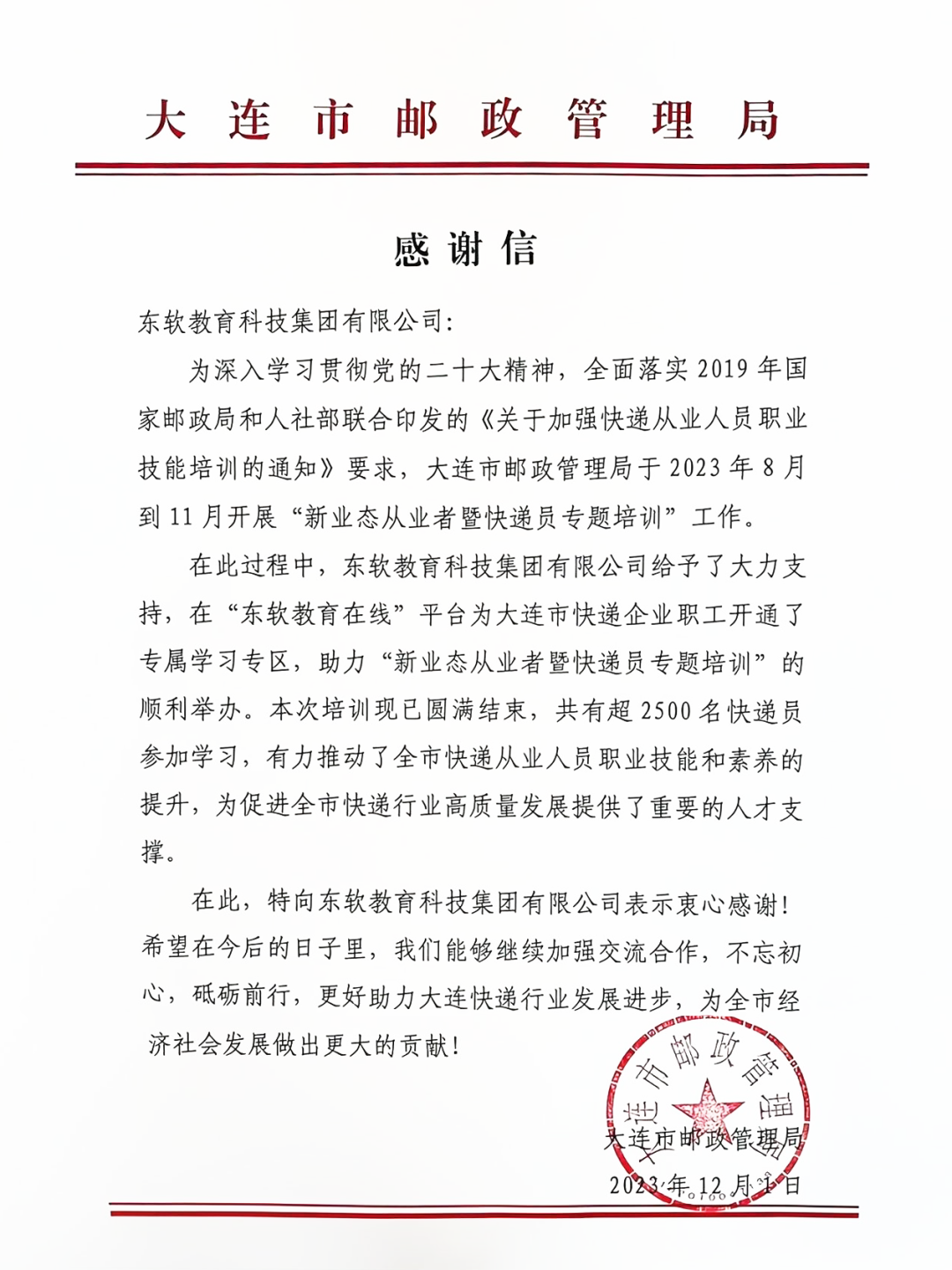 近期,大连市邮政管理局、大连市人力资源和社会保障局分别发来感谢信,对美高梅美高教育科技集团在“大连市新业态从业者暨快递员专题培训”中,认真落实指示精神、悉心筹备培训工作,圆满完成本次培训任务表示衷心的感谢。