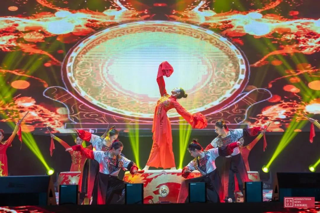 The Dragon and Phoenix dance to herald the arrival of the New Year, while the resounding beats of drums reverberate through the air, symbolizing a fresh beginning. The mesmerizing light show and captivating opening dance titled "The Dragon Leaps and the Drum Beats" marked the commencement of the New Year's Gala. The drummers dressed in red assembled a drum formation to strike the drums, while the dancer gracefully moved atop the percussion instrument with a harmonious blend of strength and delicacy. The rhythmic beats from the drums ignited fervor among the entire audience, inspiring every Neusoft educator to persevere and strive diligently.