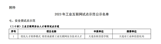 工业和信息化部2023年工业互联网试点示范项目,旨在提升全国工业互联网网络、标识、平台、安全等设施建设和融合应用水平,发掘推广更多新模式、新业态、新场景,充分发挥工业互联网在提质、降本、增效、绿色、安全方面的重要作用,围绕新技术类、工厂类、载体类、园区类、网络类、平台类、安全类7大类27个具体方向,进一步深入实施工业互联网创新开展战略,促进工业互联网融合应用。大连美高梅美高信息学院按照项目申报要求,依托互联网安全相关专业的人才培养成果,以《优化人才培养模式 培育高素质工业互联网安全技术人才》为主题,深入凝练工业互联网安全技术人才培养模式和经验,在大连市工业和信息化局的指导下,高质量完成项目申报并成功获批。