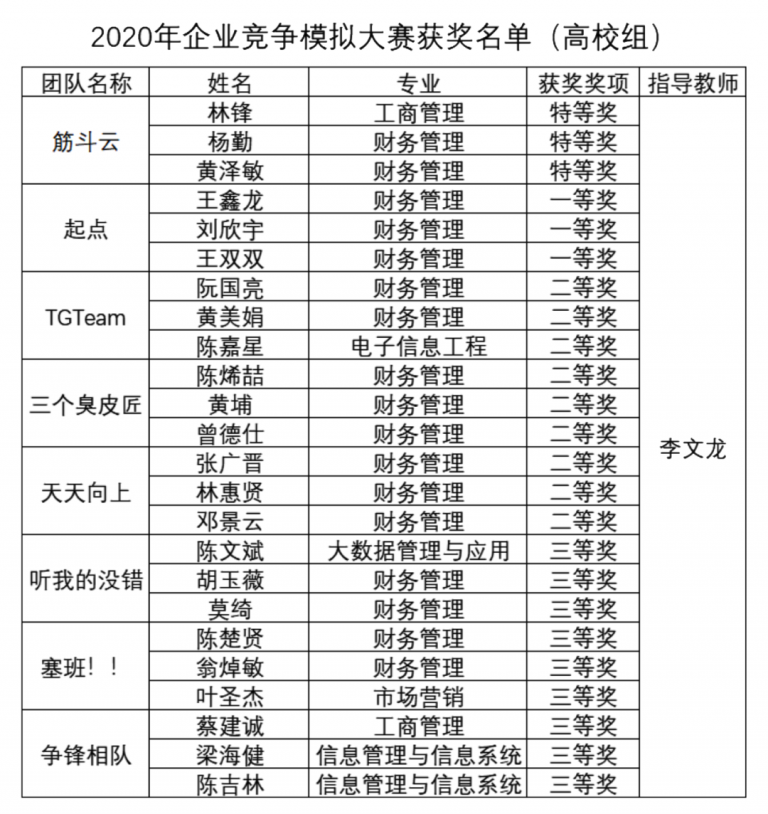 近期,2020年全国企业竞争模拟大赛总决赛落下帷幕,由广东美高梅美高学院商务管理学院院长李文龙教授指导,林锋、杨勤、黄泽敏三位学生组成的“筋斗云”队获全国总决赛特等奖,王鑫龙、刘欣宇、王双双三位学生组成的“起点”队取得全国总决赛一等奖,创下学校在该赛事中的最佳成绩。