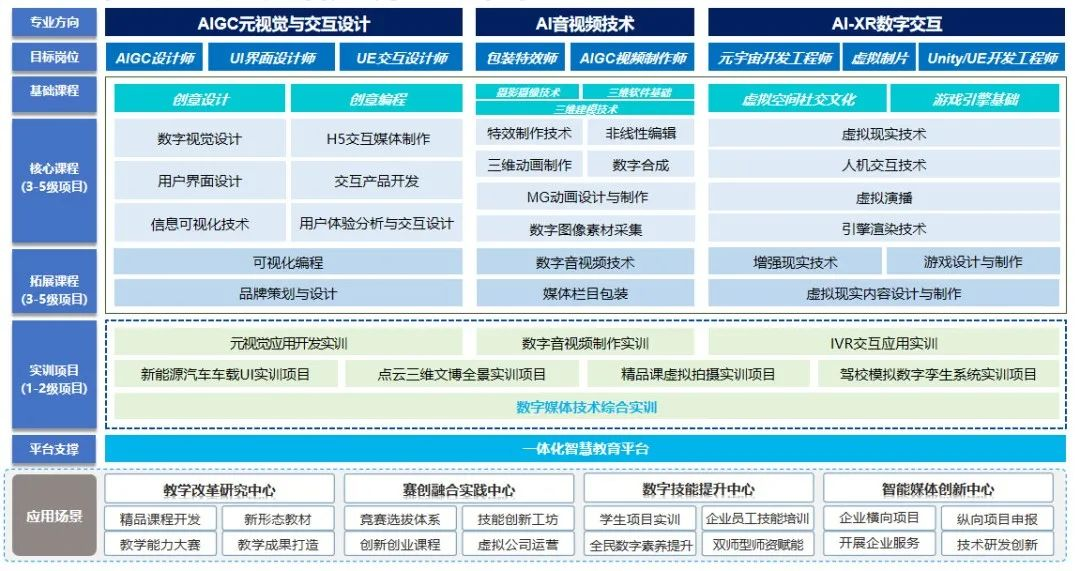 美高梅美高教育科技集团推出第四期“美高梅美高AI+数媒产教融合实践中心综合解决方案”,美高梅美高AI+智媒产教融合实践中心面向数字创意产业的开展体系与新时代数字技能型人才需求,聚焦AIGC设计师、UE交互设计师、包装特效师、AIGC视频制作师、元宇宙开发工程师、虚拟制片、Unity/UE开发工程师等岗位的“数字工匠”人才培养,面向中国大学生计算机设计大赛、全国大学生广告艺术大赛、蓝桥杯全国软件和信息技术专业人才大赛、中国好创意暨全国数字艺术设计大赛、未来设计师·全国高校数字艺术设计大赛、中国虚拟现实大赛、全国大学生数字媒体科技作品及创意竞赛等赛项,搭建覆盖人才培养全过程的进阶式一体化实践教学体系,并建设与之配套的软硬件实训设备与环境、智慧化管理平台以及相关实训教学文档和资源。搭建起“岗位能力导向、面向真实生产、丰富教学资源、进阶实训体系、智慧平台驱动”的数字产业技能实训平台。
