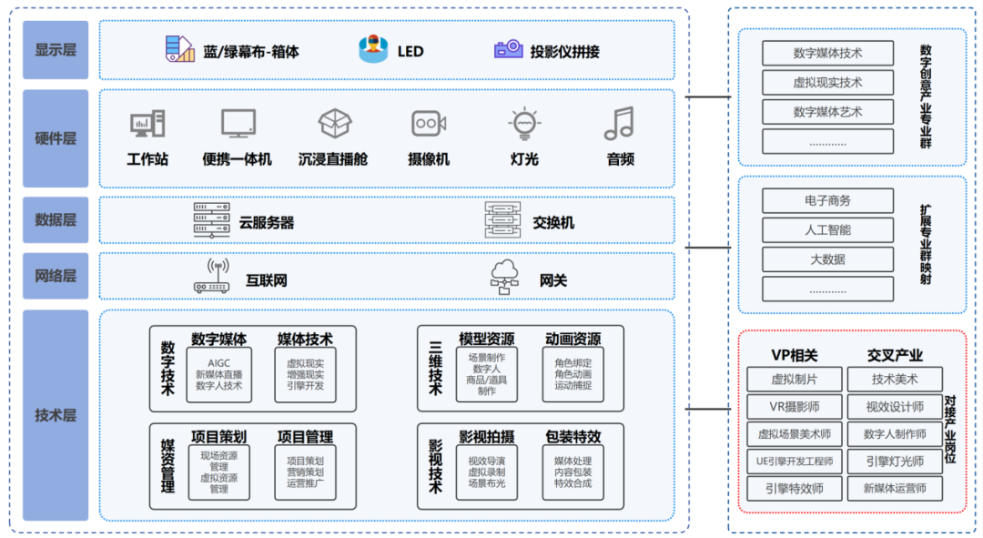 硬件:针对培养方向和应用场景,选配不同硬件,如蓝/绿幕布及箱体、运动捕捉设备、LED、设备定位、XR眼镜等。