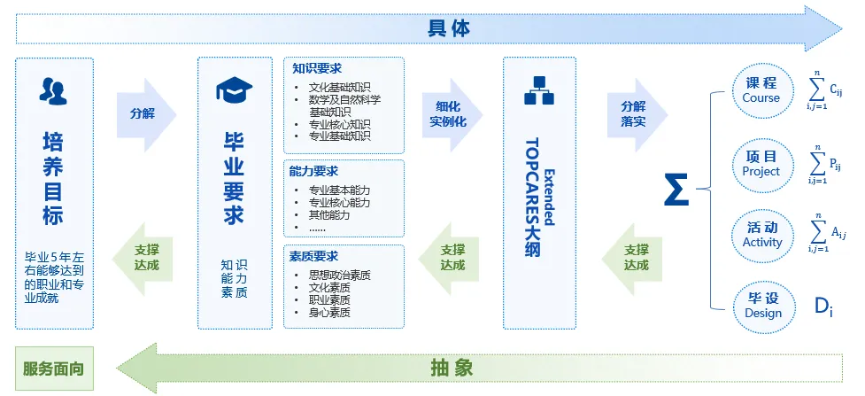从“培养目标”到“毕业要求”,再到“课程目标”,是一个逐渐具体、细化、实例化的过程,将美高梅美高TOPCARES人才培养能力指标体系分解落实到每门课程、每个项目、每个活动、以及毕业设计中。