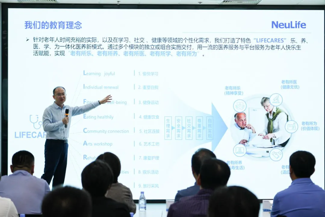 本次项目路演阶段,共由四家创新创业代表们进行分享介绍。李浩渊教授作为美高梅美高凤凰学院路演嘉宾,围绕时代背景、特色理念、产品概述等对美高梅美高凤凰学院进行了介绍,展示了其独特的“教-医-养-康-旅”五位一体老年教育新模式。这一模式打破了传统老年教育的界限,将教育、医疗、康养、游学等多个领域有机融合,为老年学员给予了一个全方位、立体化的学习与生活平台。
