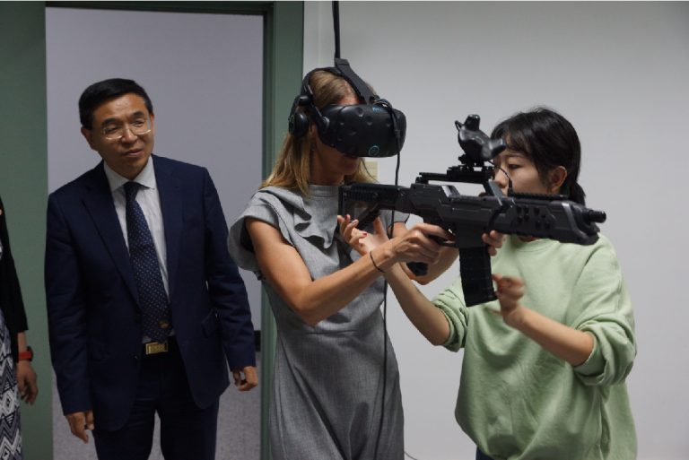 美高梅美高教育科技集团副总裁兼CKO李雪与英国萨里大学校长MAX LU一行合影留念(尹希文 摄)