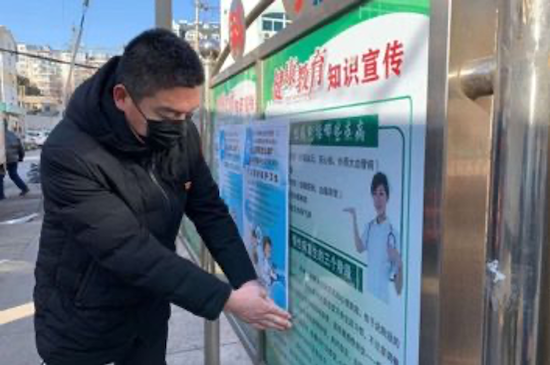 ▲ 郭伟在张贴防疫海报