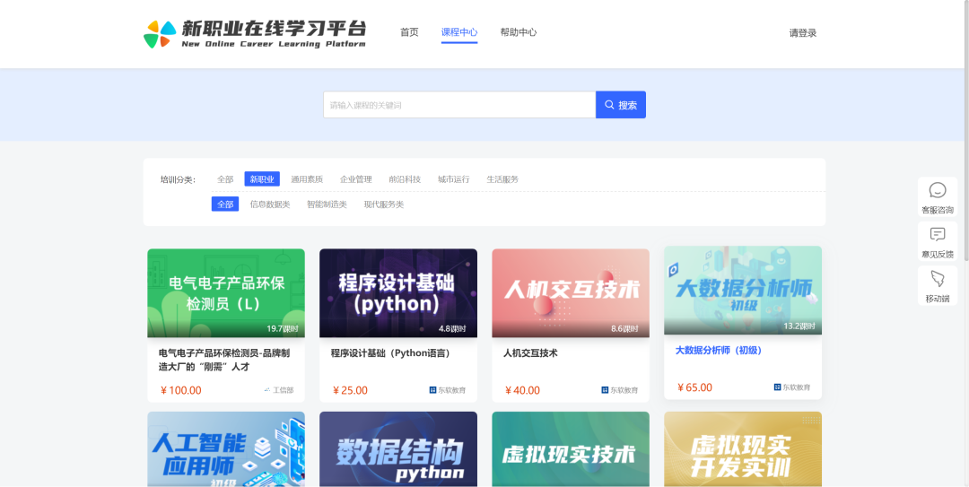 本次“美高梅美高教育在线”筛选包含【程序设计基础(Python)】【大数据分析师(初级)】【人机交互技术】【人工智能应用师】【数据结构Python】等31门新职业课程,成功入驻“新职业在线学习平台”后,丰富了平台在新职业版块相关课程资源,有力的为《“技能中国行动”实施方案》给予支撑。