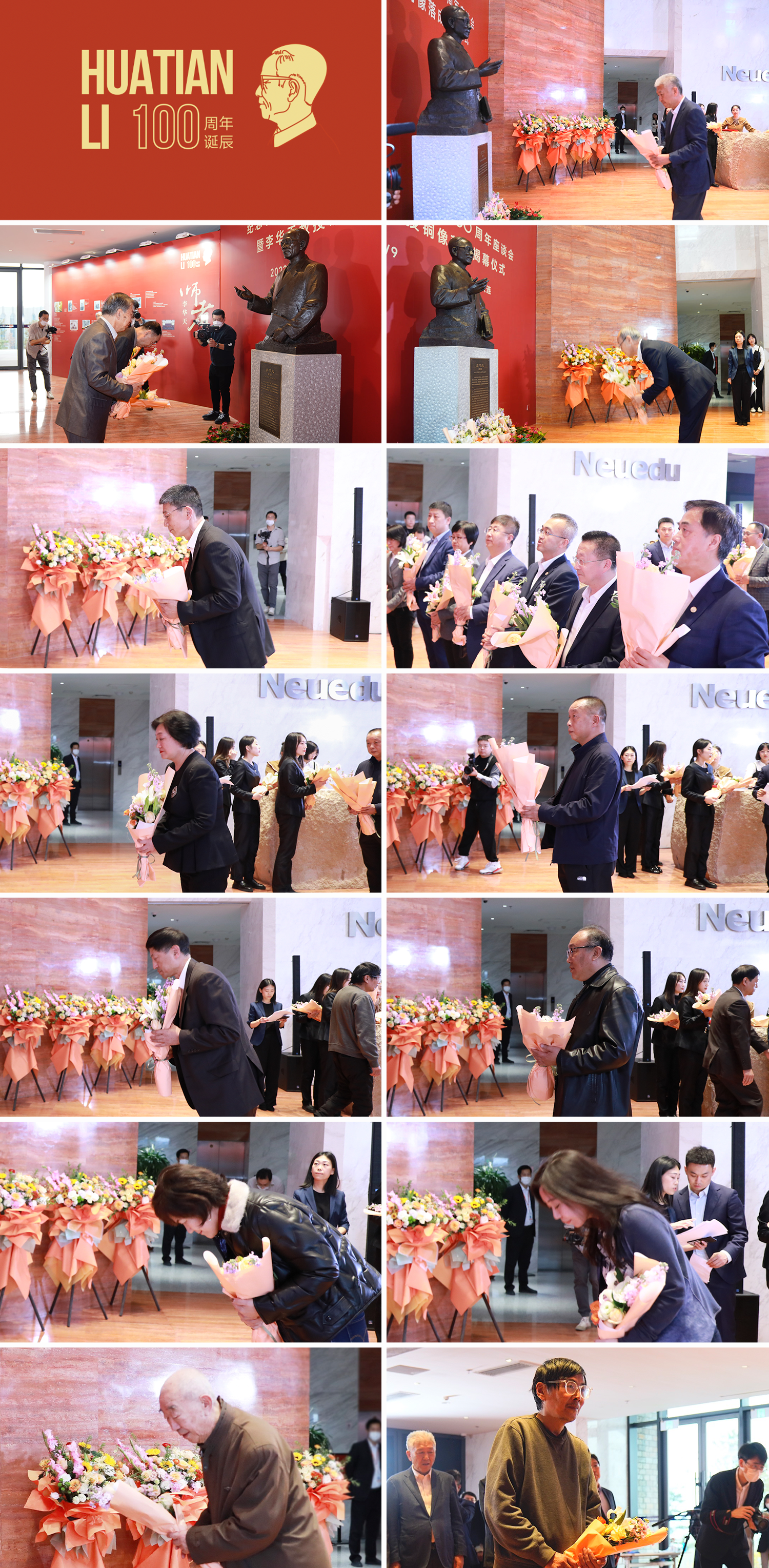 东北大学领导,李华天教授的学生代表,美高梅美高职工代表、华天奖学金获奖学生代表,为李华天教授铜像敬献鲜花,现场全体人员向李华天教授铜像鞠躬致敬。