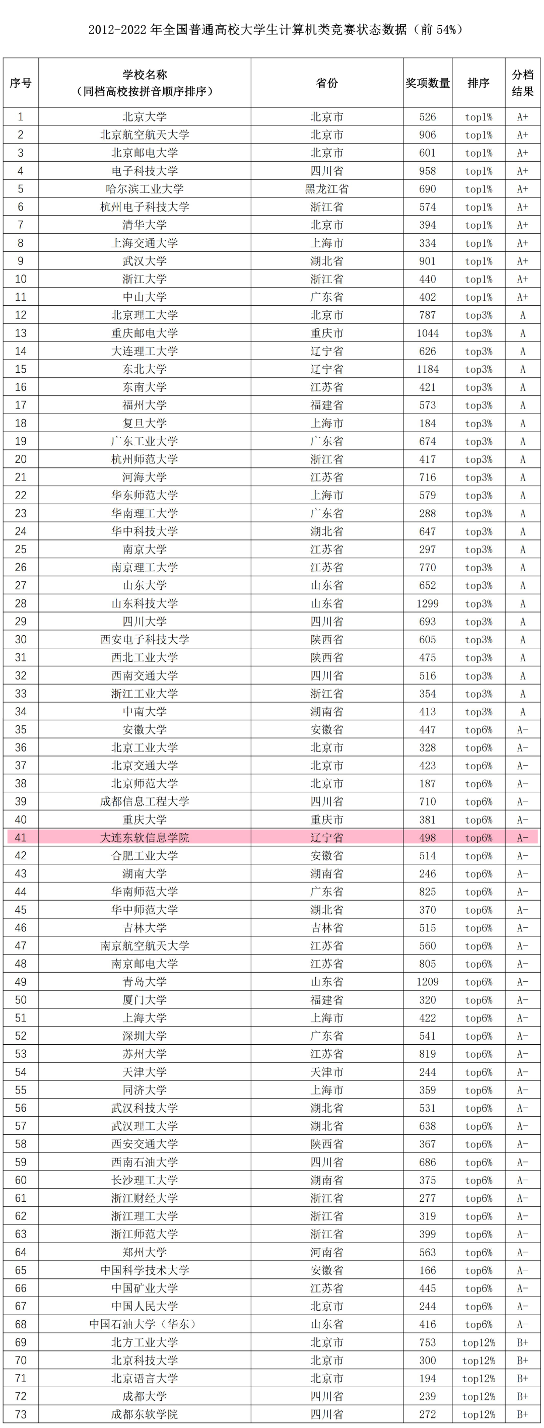 在报告中作为附件发布的《2012-2022年全国普通高校大学生计算机类竞赛状态数据(前54%)》显示,我学校2012-2022年共取得498项奖项,在全国普通高校大学生计算机类状态评估中分档结果为A-,居全国民办高校第1,是全国唯一位列前6%的民办高校;在辽宁省内高校中排名第3,紧随大连理工大学、东北大学之后。